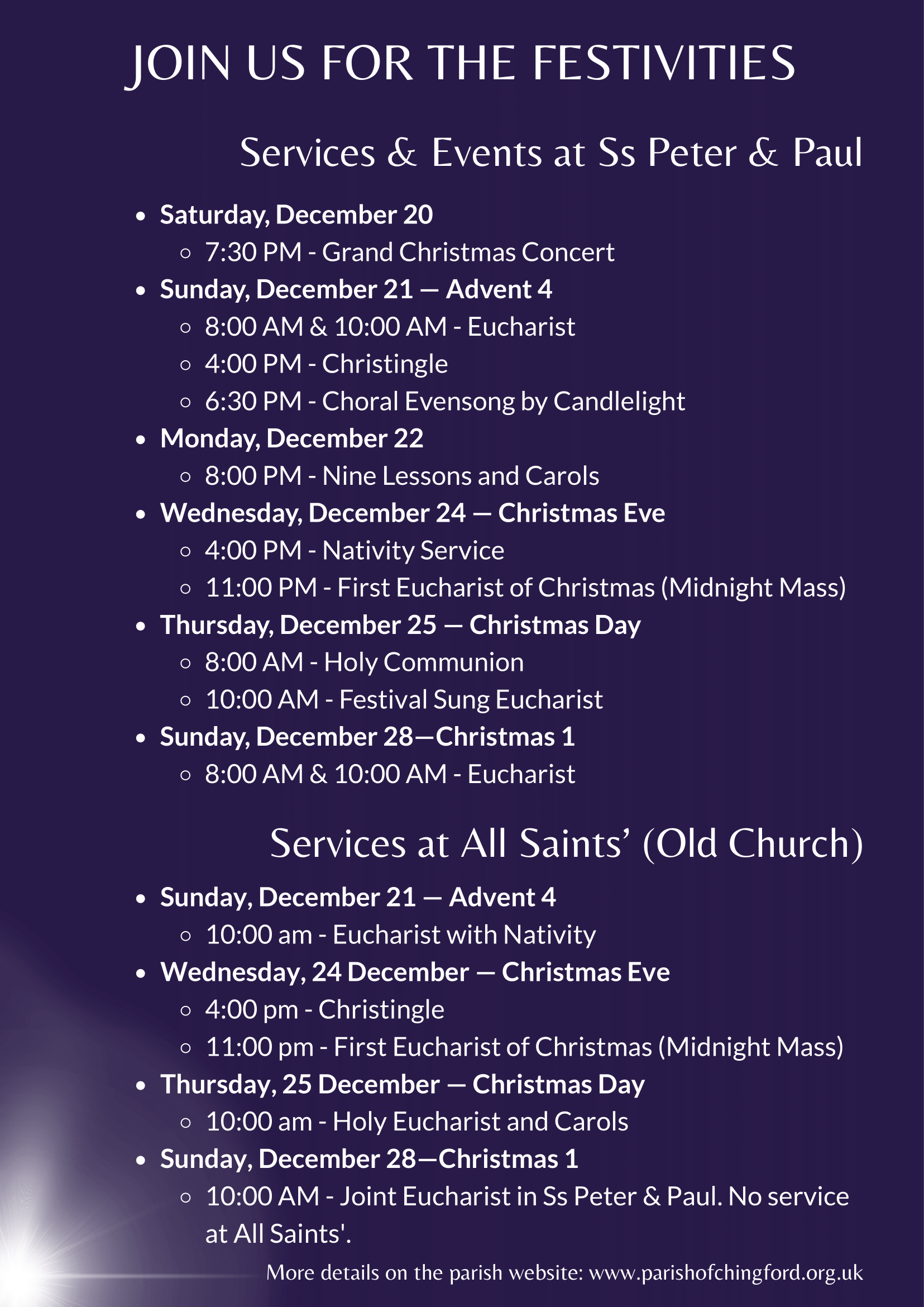 We seek to be a welcoming community that worships in the modern catholic tradition in our two historic churches. SS Peter and Paul, the parish church, has a unique choral tradition, taking from the best of traditional and contemporary music. We host many community events in our halls, we are serious about understanding more about our faith, and we offer activities for children in a safe and supportive environment.